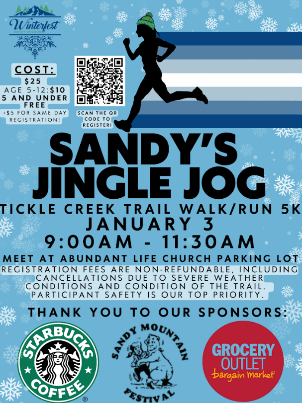 - January 3rd- Jingle Jog: from 9:00am-11:30am, Tickle Creek Trail