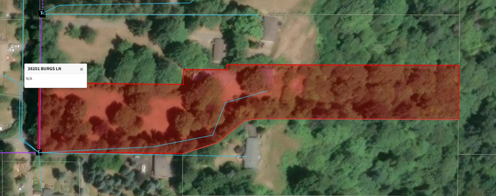 38201 Burgs Lane Detached ADU or duplex unit: Development Services Department staff provided pre-application notes to an applicant that would like to construct an approximately 1,382 square foot accessory dwelling unit (ADU) or duplex unit at 38201 Burgs Lane. The property is on the corner of Burgs Lane and Baumback Avenue and the new dwelling unit would be associated with the existing home and garage on the property. The property is currently using a septic tank and drain field, and the applicant was informed that Clackamas County has the jurisdiction to approve an expansion to their existing system. The applicant prefers that the new dwelling is located on the southwest corner of the property close to the existing street intersection.