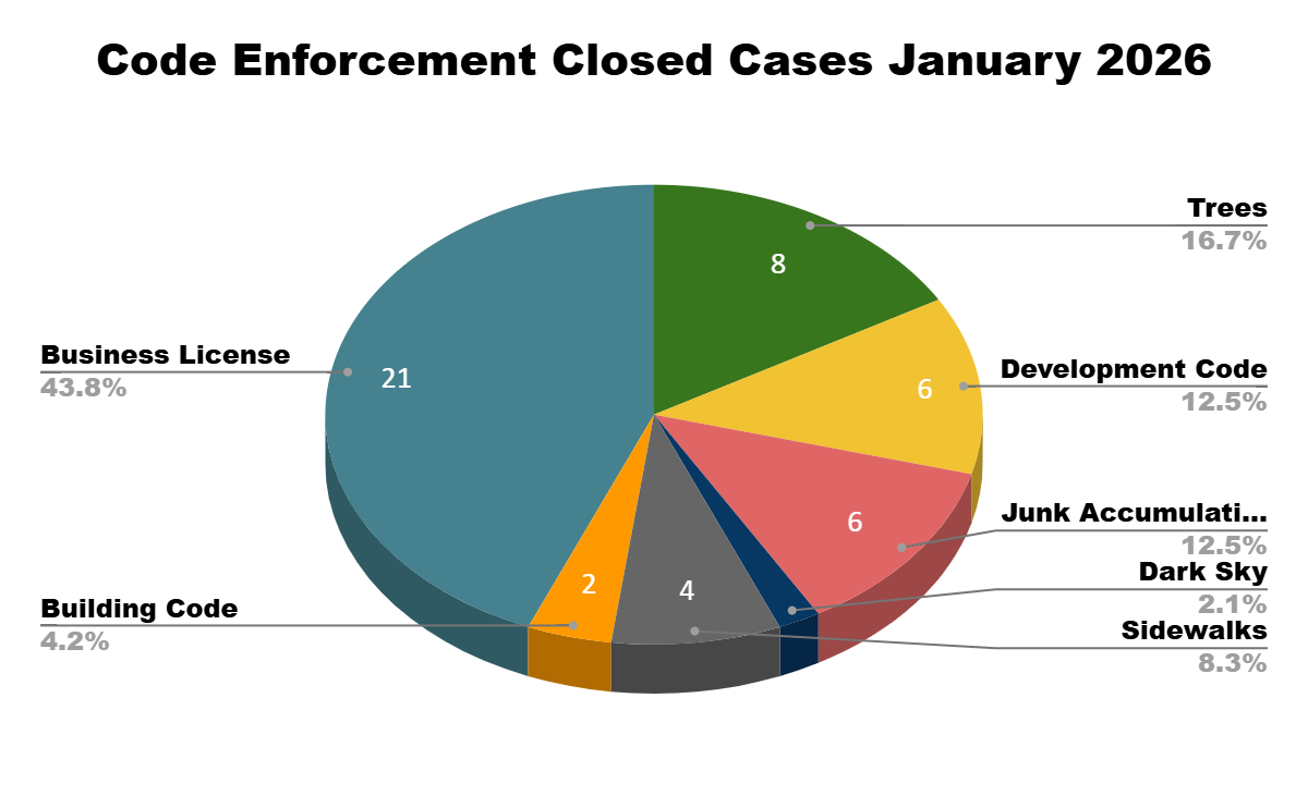 - 1 citation was issued to a property owner on Seaman Street for continuing to store a temporary storage unit on the property beyond the 60 day limit.