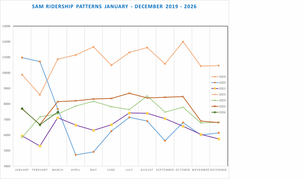 March 2026 ridership declined slightly, compared to March 2025 ridership with a 8.18% decline, providing 7,483 one way trips. SAM-Gresham provided 5,159 and was down 11.04% compared to last year at this time. SAM-Estacada experienced a 12.23% increase, providing 716 rides. SAM-CTC was down 46.26% providing 302 rides. The Shopper Shuttle had 532 riders, a 19.02% increase. We believe this small decline was a temporary reduction, possibly due to spring break vacations.